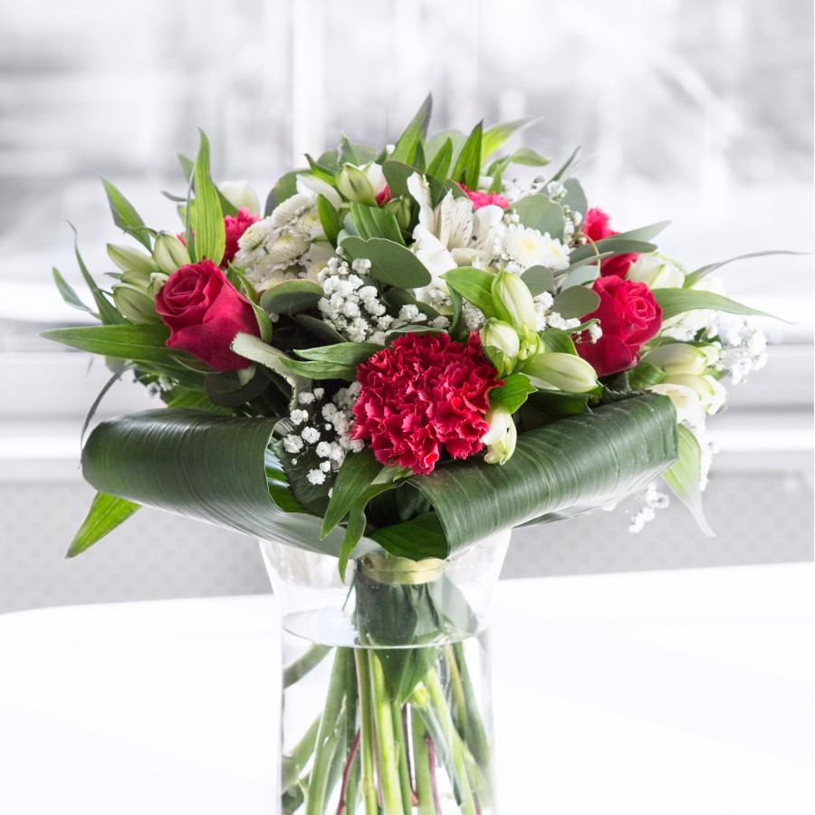 This bouquet is a vibrant celebration of color and design, featuring sweet white chrysanthemums and delicate gypsophila, paired with luxurious red roses and bright carnations. Enhanced by white alstroemeria and lush aspidistra leaves, the arrangement is both eye-catching and sophisticated.
